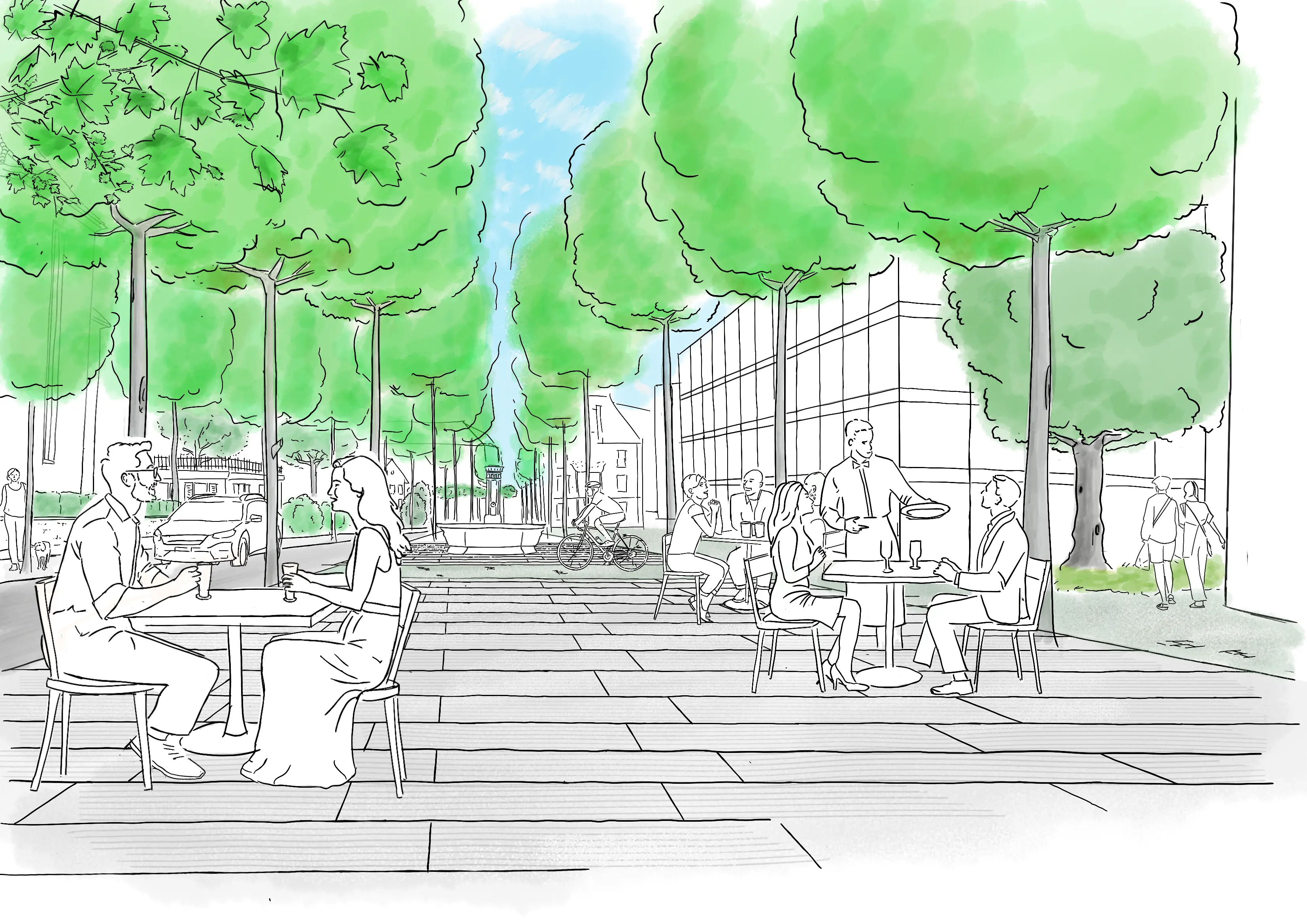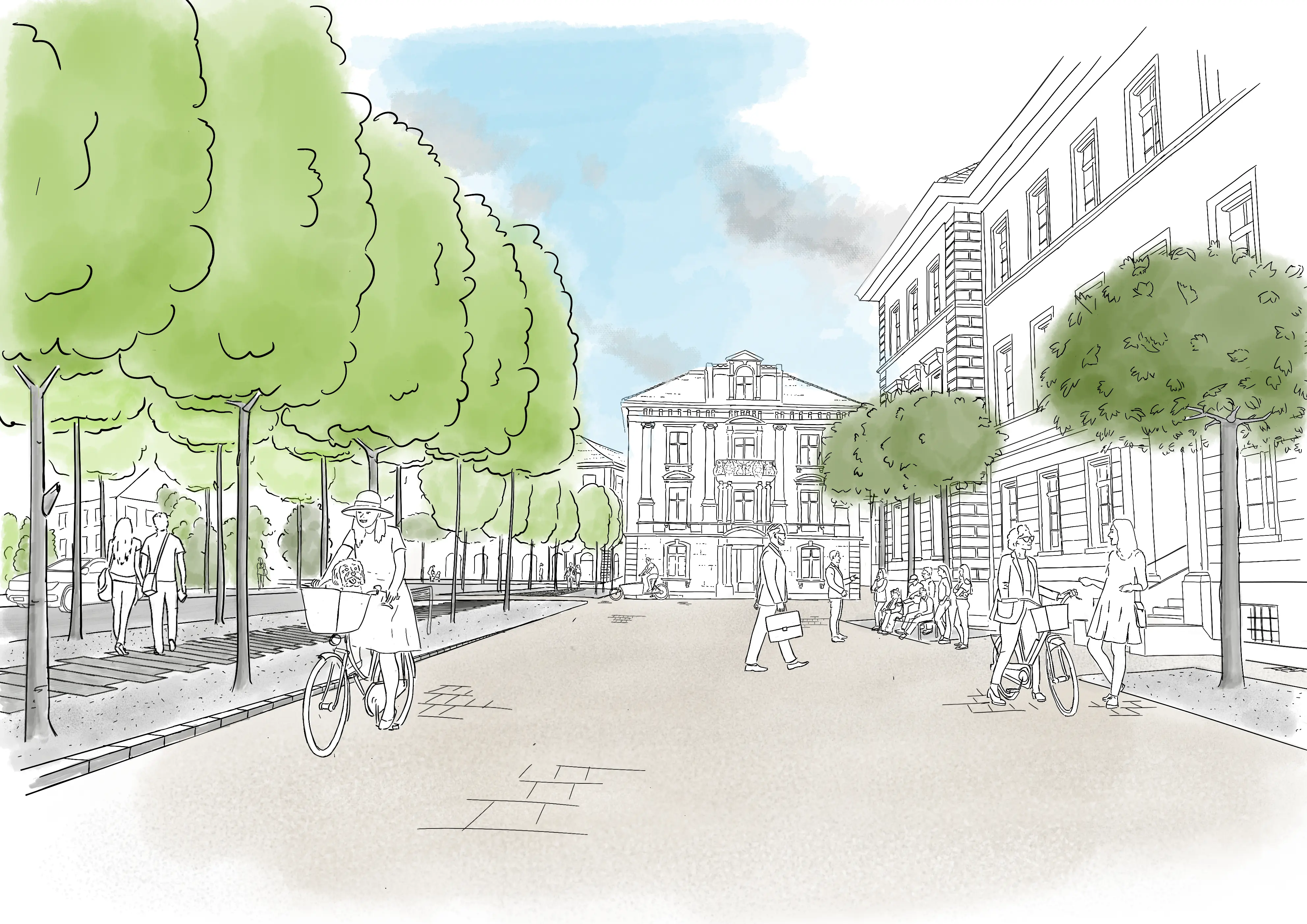 Trottoir neuer Bodenbelag mit punktuellen Betonungen vorhandener Gewerberäume