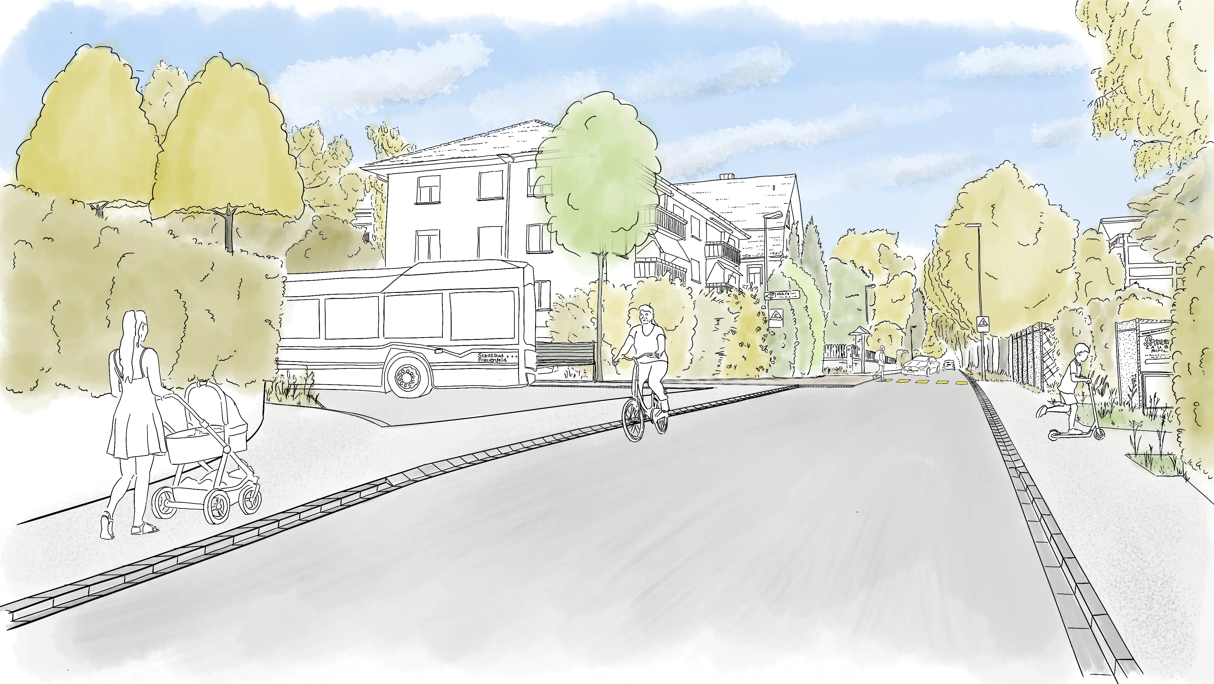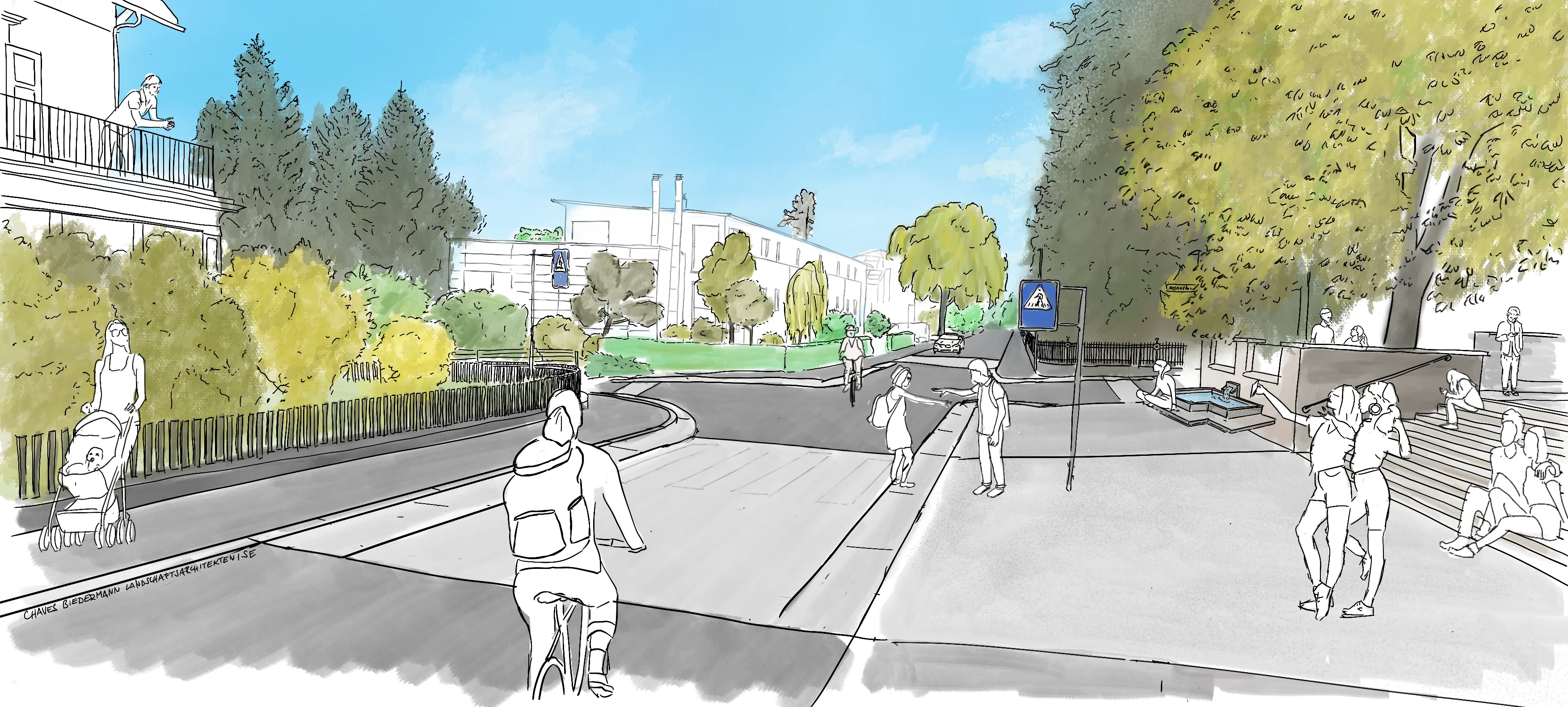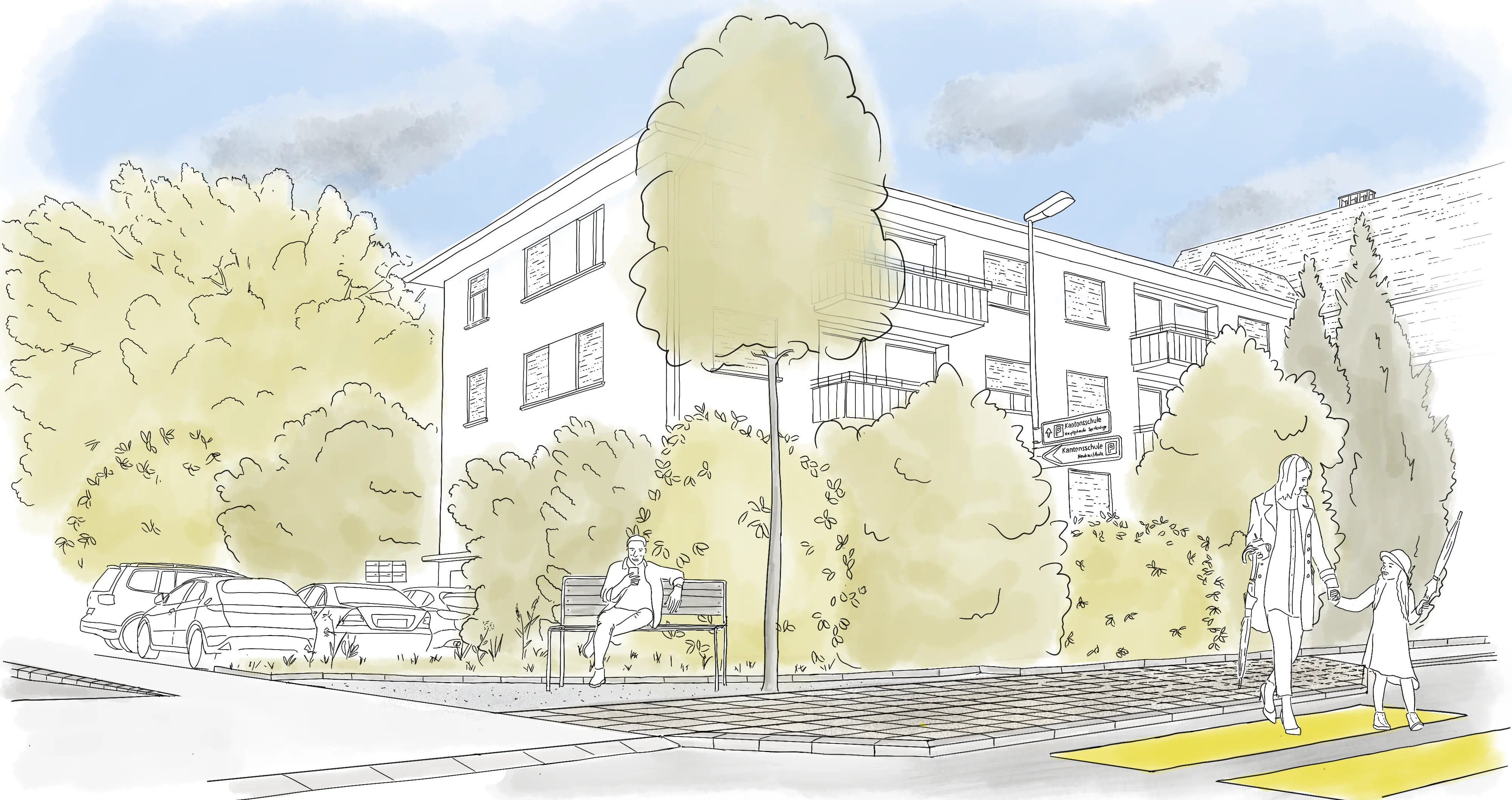 Grünstreifen mit Staudenpflanzungen und Fahrradabstellplätze oder