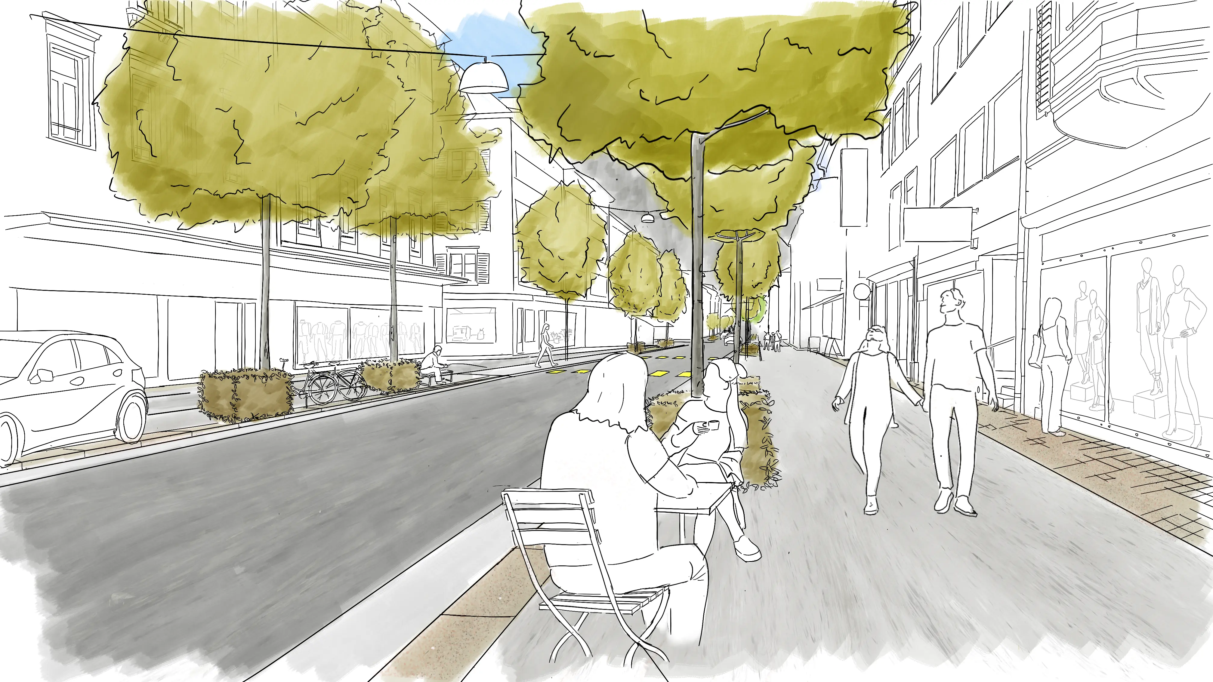 breiter Mittelstreifen für sicheres Strassenquerung der Fussgänger